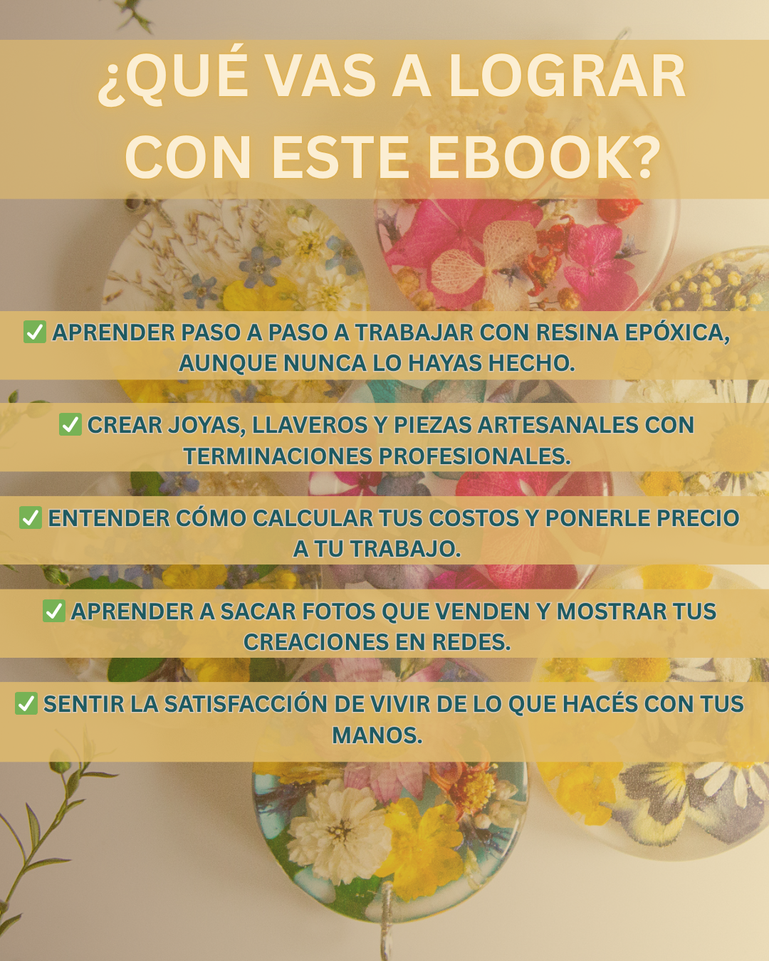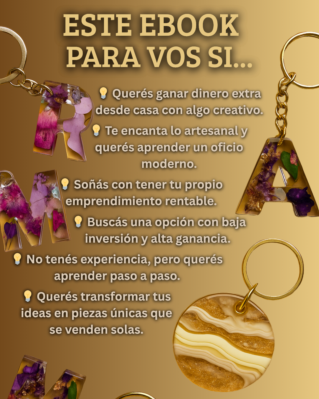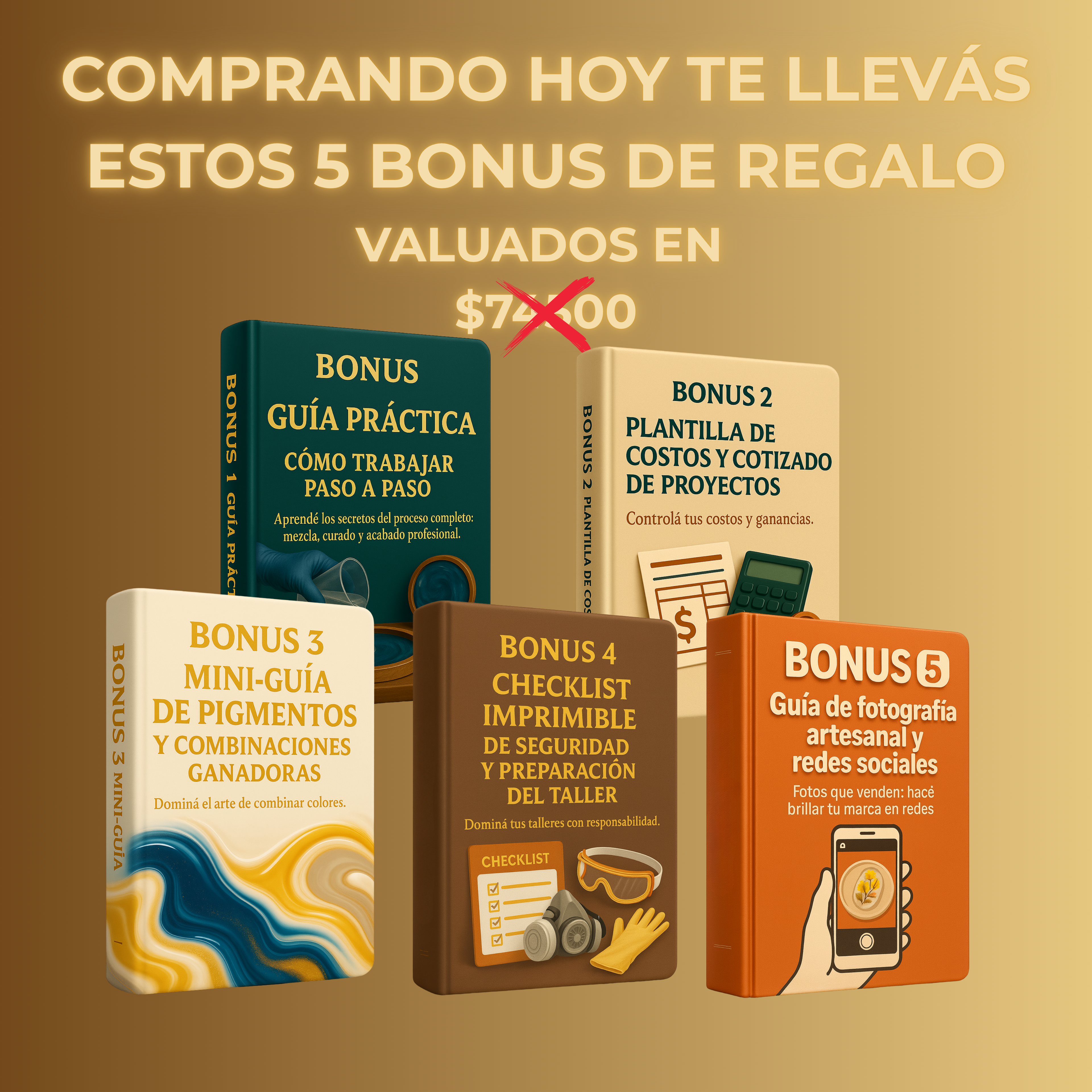 "Empecé hace 3 meses sin saber nada de resina. Hoy ya vendí más de 200 piezas y estoy ganando más que en mi trabajo anterior. Las técnicas del ebook son clarísimas y los resultados increíbles. ¡100% recomendado!"